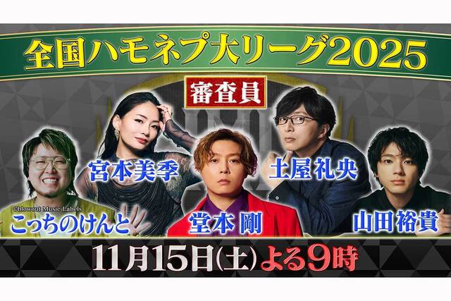 DOMOTO、.ENDRECHERI.の堂本剛が15日放送のフジテレビ系『全国ハモネプ大リーグ2025』(午後9時)で審査員を務めることが8日、発表された。 【写真】『全国ハモネプ大リーグ』本戦に勝ち上がった12組 審査員には堂本のほか、シンガー・ソングライターのこっちのけんと、宮本美季、俳優の山田裕貴、アカペラグループ・RAG FAIRの土屋礼央が参加。 MCはネプチューン、進行はチョコレートプラネットとフジテレビの堤礼実アナウンサーが担当する。 ネット上では「わーい!剛くん審査員嬉しい~!」「絶対見る」「審査員やるの!?!?」といった驚きと喜びの声が上がっている。 【大会ルール】 ■1回戦(3組×4ブロック) ・抽選会で組み合わせを決定 ・審査員は各100点を持ち点とし、500点満点で勝敗を決定 ・各ブロックで最高得点のグループが決勝へ進出 ■決勝戦(4組) ・審査員の採点合計で日本一を決定(500点満点) ■その他ルール ・1回戦での同点の場合はハモネプOB土屋礼央の採点が高い方が勝利 ・それも同点なら共に勝ち残り ・決勝で同点の場合は同時優勝 ・演奏中止は大きな減点対象